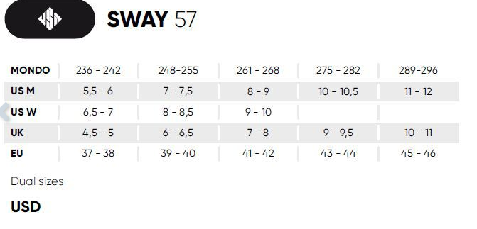 The USD Sway 57mm can be described as: stylish with clean and simple design and great features you can get for your money. Maybe the best start-up aggressive skate ever. The Sway is a well fitting boot including a USD Basic liner, a thick shock absorber as well as a wide and fast sliding soul plate, and Kizer's all-new Fluid V frame. This new perfectly shaped flat frame comes with 57mm USD wheels and Wicked Carbon Pro bearings and can be upgraded for flat setups up to 61mm. The Sway 57 is a great value skate from the best aggressive skate brand in the world - USD.